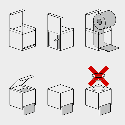 3. Zum Befüllen klappen Sie den Deckel der LooPaBox auf. Das Toilettenpapier wird unten abgerollt. Rollen Sie die ersten drei bis vier Blätter ab und führen dieses in den Ausgabeschlitz ein und ziehen ein bis zwei Blatt mit dem Einlegen der Rolle heraus.Fertig! Ihre LOOPABOX ist bereit!